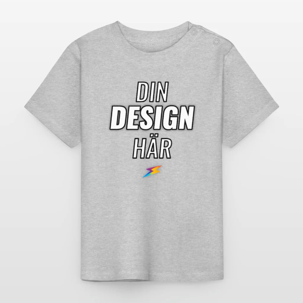 T-shirt med korta ärmar för bebisar och små barn. För att man lätt ska kunna ta på och av T-shirten finns det tryckknappar av ett nickelfritt material på vänster axel, som man knäpper upp för att förstora öppningen. Vikt: 200g/m². 100 % bomull. (gråmelerad 85 % bomull, 15 % polyester)